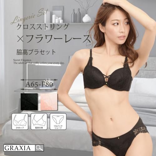 繊細なフラワーレースで、肌を美しく見せつつ大人の色気を添えて。フロントのクロスストリングから溢れる、みずみずしいセクシーさが魅力。下厚パッドと脇高仕様でバストを逃さず、身に着けるだけでボリュームUP♪