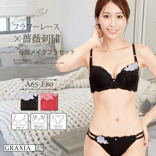 繊細なフラワーレースのさりげない光沢で、素材の美しさが際立つ。アクセントの薔薇の刺繍が、品よく高見えするポイント。下厚カップと柔らかパッドで、自然な上向きバストに。