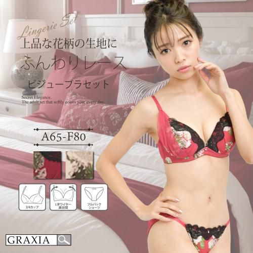艶やか女性をアピールできちゃう気品高いデザインのブラ・ショーツセット(ブラセット)。上品なお花柄の生地に、サイドにはふんわりレースがあしらわれています。同素材のショーツは、ウエストラインのレースにシルバーのラインストーンがワンポイントになり、より上品さを引き出させます。