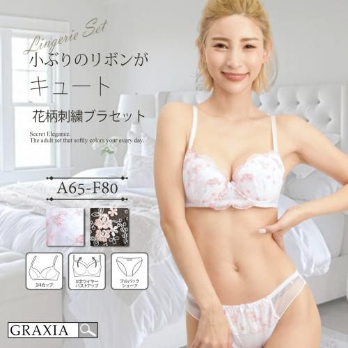 小さな花柄の刺繍に小ぶりのリボンがキュートなブラ・ショーツセット(ブラセット)。優しく包み込むバスト部分はみんな大好きな花柄でデザインされております。同素材のショーツは、ウエストラインにふんわりレースがあしらわれており、守ってあげたくなっちゃう可愛さ溢れるセットです。