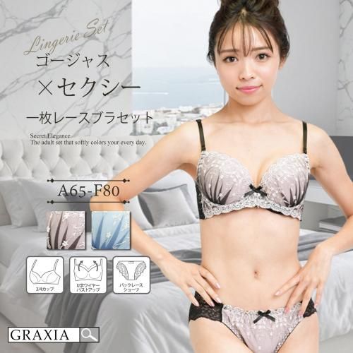 ゴージャス感溢れるレースが大人の雰囲気を魅せるブラ・ショーツセット(ブラセット)。レースで柔らく包み込まれるバストラインと、同素材でデザインされたショーツのセットです。バックスタイルは透け感抜群の総レースでデザインされており、とびきりセクシーです。脇高になっており、すっきり着やせ効果も抜群です。