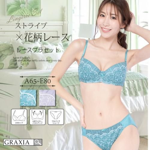 若さ溢れるデザイン、ストライプ生地にレースが可愛いブラ・ショーツセット(ブラセット)。ストライプの生地に花柄レースが可愛い印象を与えてくれます。優しいふんわりカーブが自然なバストラインを作ってくれ、初めてのブラにもピッタリです。お手持ちのパッドを入れてサイズ感の調節も可能な商品となっております。