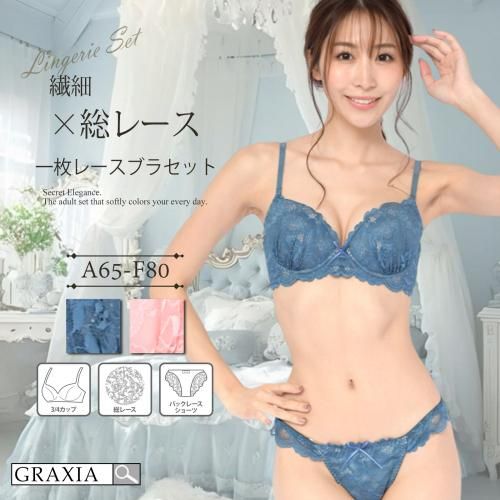 バック総レースによる肌の透け感がとてもセクシーなブラ・ショーツセット(ブラセット)。繊細なレースが大人らしいデザインです。取り外しのパッドがついており、ボリューム調節が可能です。ショーツは、総レースで、フロントとクロッチ部分に裏地がついており、バックは裏地が無くアウターに響きにくい総レース仕様となっております。