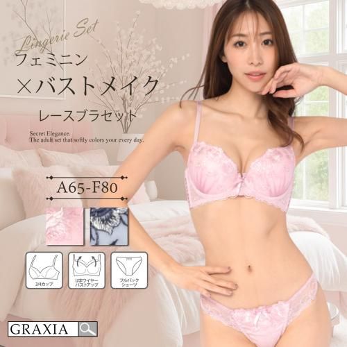 フェミニンな印象を与える可愛らしいブラ・ショーツセット(ブラセット)。レースをふんだんにあしらった華やかなデザインが特徴的なブラセット。カップの両サイドに施された編み上げがセクシーさを引き立てます。3段ホックでしっかりバストメイクを可能にしながら、伸縮性抜群のレースでソフトな付け心地に。ショーツはサイドからヒップラインにかけてレースをあしらえアウターに響きにくい一枚に。