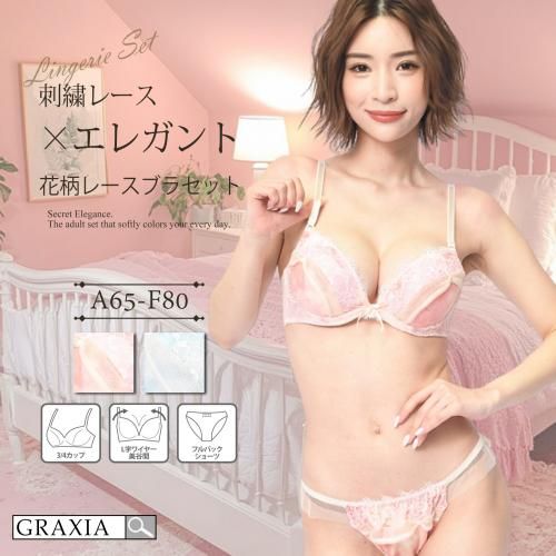 透かし効果のフラワー刺繍レースがエレガントな印象のブラ・ショーツセット(ブラセット)