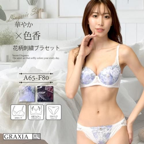 華やかで洗練された色香漂うレディにぴったりのブラ・ショーツセット(ブラセット)。可憐な花柄プリントに同じく可憐な花柄と葉の刺繍を掛け合わせた絶妙なデザインのブラセットです。ブラとショーツの中心にキラリと光るチャームがアクセントになり、より華やかさをアップさせてくれます。U字バックと脇高できっちりバストメイクを忘れない、デザインだけに頼らない嬉しい機能も備えています。ショーツはヒップラインにレースをあしらい、アウターに響きにくく可愛いさ溢れる一枚に仕上げました。