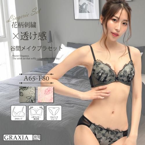 花柄刺繍が可愛らしいブラ・ショーツセット(ブラセット)。透け感のあるメッシュ生地を使用し、可愛らしい中にもセクシーさを引き出してくれるアイテム。ブラとショーツの真ん中にさり気なくリボンがあしらわれて、大人可愛いレディに変身させてくれます。取り外し可能なパットが付いているの嬉しいポイント。谷間メイクを忘れず自然な丸みのあるバストラインを作り、脚長効果が期待できるデザインショーツで気分も上がるブラセットです。