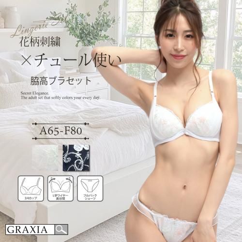 花柄刺繍とチュール使いが可憐なブラ・ショーツセット(ブラセット)。ブラジャーは脇高仕様で脇に流れるバストをしっかり固定。中心にあしらった華奢なクリスタルチャームがアクセントに。ショーツもブラジャーと同柄刺繍でチャーム付き。サイドはチュールを合わせたストリングスでちょっとセクシーな印象に。