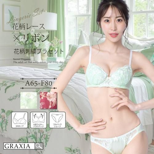 かわいい花柄を豪華な刺繍で表現したブラ・ショーツセット(ブラセット)。優しい印象の花柄レースと中央のリボンで華やかに仕上げた大人の女性のためのセット。ブラは取り外しできるパッド入りで、ボリュームの調節が可能です。セットショーツのバック身生地には縦横に伸び、光沢感のあるストレッチ素材を使用し、ヒップを優しく包み込みます。気持ち良くフィットし、快適なはき心地のスタンダードショーツです。