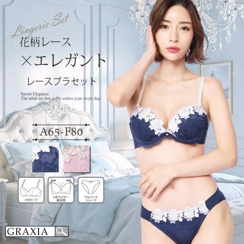 タイプの違うレースを贅沢にあしらったブラ・ショーツセット(ブラセット)。同色の花柄レースの上に、さらに胸元を華やかに演出するケミカルレースをあしらったエレガントなデザインです。取り外し可能なパッドでバスト調整が思いのままに。ストラップの色とのコンビネーションも絶妙。ショーツもブラ同様のコンビレースで構成されたノーマルタイプです。