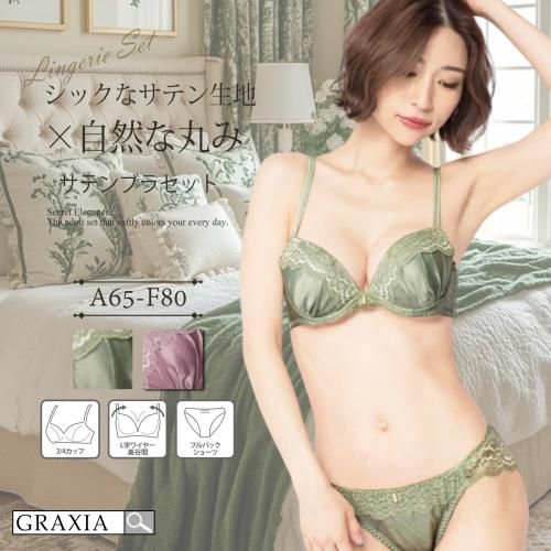 艶サテンとレースで落ち着いた大人の女性を演出するブラ・ショーツセット(ブラセット)。控えめな光沢でシックなサテン生地のブラはふんわり内蔵パッドと取り外し可能なパッドで自然な丸みのバストラインを実現。スカラップで縁取るヒップがセンシャルなショーツも大人の色香が漂います。