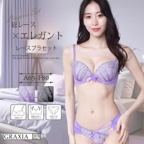 花と蝶が織りなす総レースデザインはエレガントなブラ・ショーツセット(ブラセット)。繊細なレースをふわりとのせたフェミニンな中に大人の可憐さを表現。フロントのサテンリボンも主張しすぎないアクセントに。ブラは高めのサイドボーンで脇肉をカップインしてふんわり自然な丸胸をメイク。カップ裏には取り外し可能なパッド付き。バックはU型デザインで安定感のある着け心地に。セットショーツは3本のサイドストリングが特徴的なフルバックタイプ。ソフトな生地がやさしくヒップをなめらかに心地良く包み込みます。