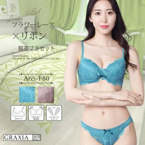 贅沢に使用したフラワーレースが大人っぽいブラ・ショーツセット(ブラセット)。繊細な花柄レースを全面に贅沢に使用し、豪華なデザインに仕上げたセット。同系色のリボンモチーフがポイントです。脇高設計で安定感があり、ふわふわの下厚カップでリフトアップ効果は抜群。お揃いショーツはフルバックレースで透け感もあってセクシーです。