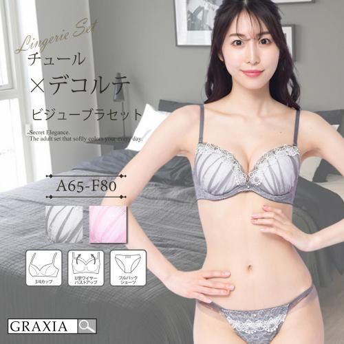 チュール生地に異素材のレースを挟み込んだブラ・ショーツセット(ブラセット)。バストを囲むように支えて上方向に持ち上げ、丸みのある自然なバストにメイキング。デコルテ部分をふっくらさせる効果をつくります。前中心にはストーンアクセサリーを添えて、華やかさをプラスしました。