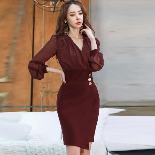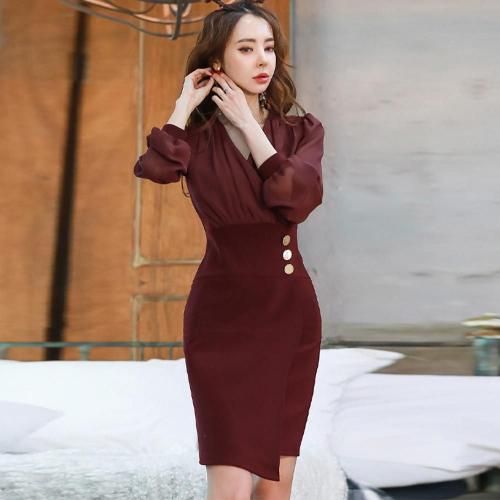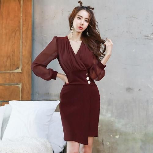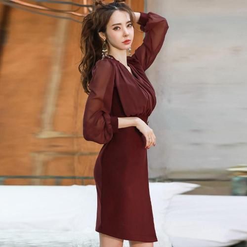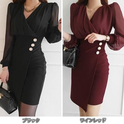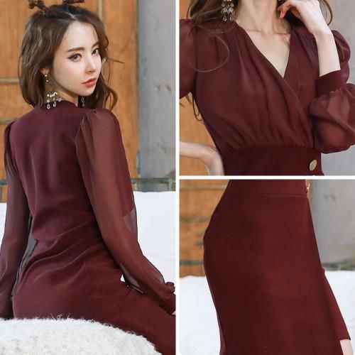 タグ:#ミディアムドレス #カシュクール #ハイウエスト #長袖 #レッド系
