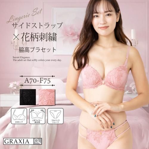 特徴的なサイドストラップがポイントの単色ブラ・ショーツセット(ブラセット)。ワントーンで上品な雰囲気漂うランジェリー。ブラはカップ全体に広がる同配色の花柄刺繍がシックな大人デザイン。脇高設定で脇肉をしっかりキャッチ!さらにU字バックで前はふんわりグラマラスながらも背中はすっきりと魅せてくれます。ショーツは2本のサイドストラップが抜け感を出してセクシーに。ブラ、ショーツともにフロントにゴールドチャームが煌めいて素敵です。