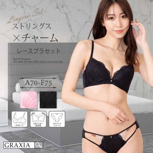 レースとチャームをあしらったブラ・ショーツセット(ブラセット)。ブラ・ショーツともにフロント部分にワンポイントのチャームが輝く上品なデザイン。バストを大きく見せたい時にも強い味方になってくれる3/4カップの形状で、バストを優しく包んでボリュームアップ。ショーツのフロントにはストリングスを斜めに這わせたデザインで女性らしさを演出します。