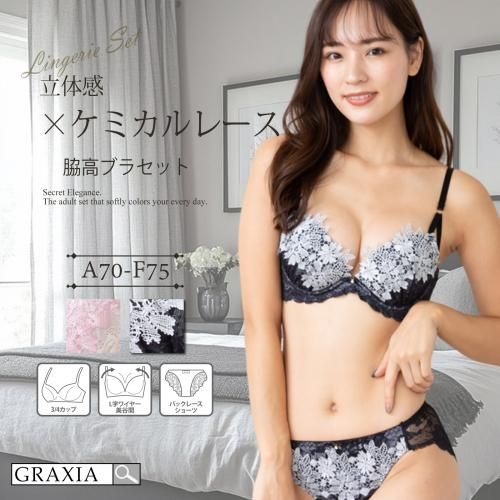 華やかなレースのあしらいが印象的なブラ・ショーツセット(ブラセット)。大人の色香を引き出す総レースにケミカルレースを添えて立体感をもたせたブラ。脇高設計で背中に流れがちなお肉をサイドでキャッチしカップ内に収めます。ブラにはストーンをあしらいアクセントに。ショーツはバックレースでアウターに響きにくいのもうれしいポイント。