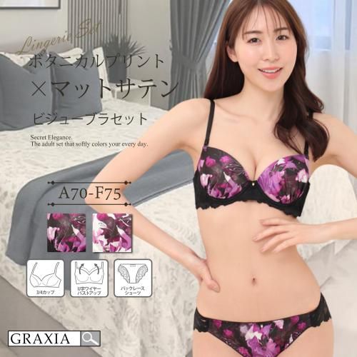 プリントとレースのミックスが大人かわいいブラ・ショーツセット(ブラセット)。鮮やかなボタニカルプリントのマットサテンにレースを合わせたブラセット。ブラはバストをやさしく包み込む安定感のある内蔵カップ。セットショーツはデイリーに使いやすいノーマルタイプ。バックレースでアウターに響きにくいのもポイント。ブラとおそろいのチャーム付きでキラリと華やかな印象に。