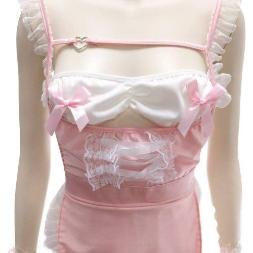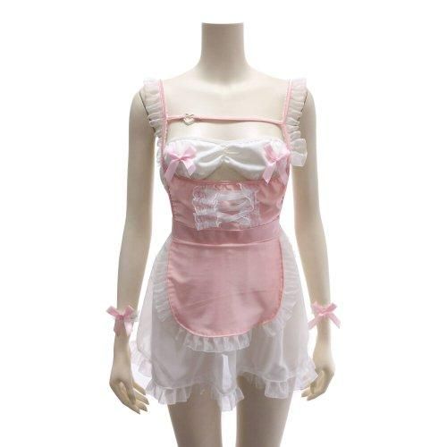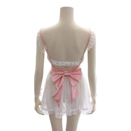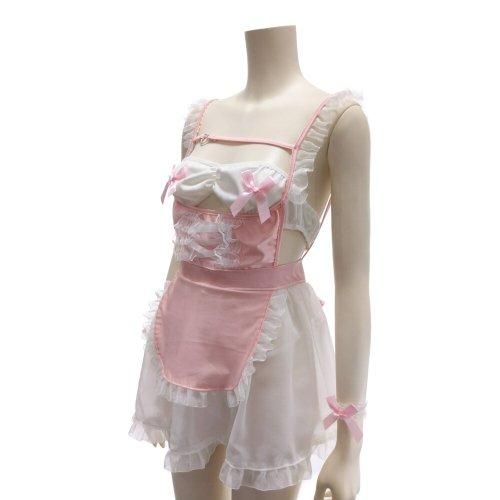 透け感がセクシーなメイド風コスプレ(COSPLAY)。ソフトなシフォン素材のスカートにオーガンジーフリルで縁取ったエプロンを付けた愛らしいワンピース。ウエストはマジックテープでサイズ調整可能。チューブトップのブラはリボンをトップにあしらってセクシ&カワイイ雰囲気に。甘々なディテールにロリータな可愛さ炸裂です♪