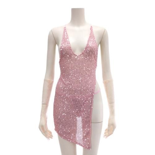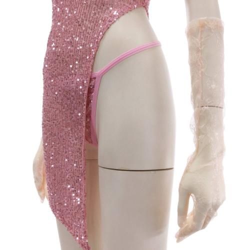 いつもと違う雰囲気を演出してくれるボディコン風コスプレ(COSPLAY)。スパンコール刺繍の煌めきとピンクが色鮮やかなワンピースのコスチューム。メッシュのさらさらした生地で仕立てたワンピースは大きくカットしたサイドスリットがセクシー。伸びの良いマカロニコードで肩の締め付け感もなくラクに着こなせます。同生地のTバックショーツ付き。普段と違った魅力を引き出してくれそうなセットです。セットのロンググローブは総レースで華やかさをさらに高めます。
