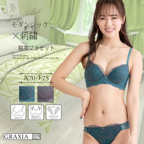モダンシックなカラーに落ち着きある刺繍が大人のブラ・ショーツセット(ブラセット)。ソフトワイヤーで長時間窮屈に感じることなく着用しやすい脇高設計。脇に流れたバストをしっかりキャッチし、パッドが内蔵だからナチュラルで美乳に盛れます。ショーツはヒップ部分がレースのためアウターに響きにくく、クリスタルチャームでさり気なく高見え。