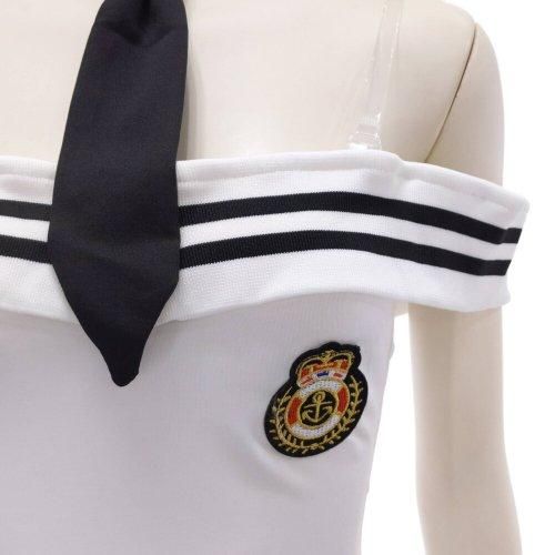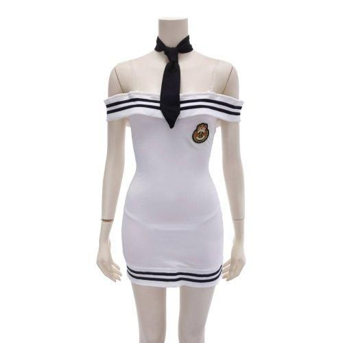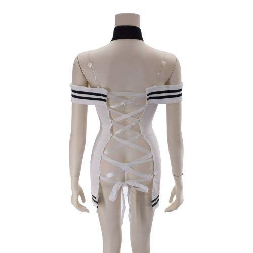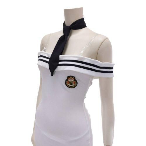 オフショルが女性らしい海兵風ワンピースのコスプレ(COSPLAY)。フロントから見る姿は、ホワイトにブラックのラインが清涼感があり女性らしいオフショルダーが爽やかな印象。しかしそれとは対象的にバックスタイルはレースアップで大胆に。キュートとセクシーのギャップの差が二面性を持った彼女にピッタリな一点です。