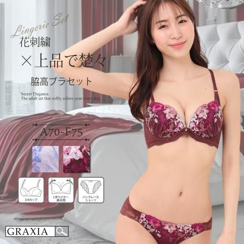 華やかで洗練された花刺繍がアクセントのブラ・ショーツセット(ブラセット)。ブラとショーツの中心に愛らしいリボンがアクセント。華やかさを持たせたブラセットです。上品で楚々としたイメージを与えます。脇高カップで背中のお肉をしっかりカバーし、下厚パッドで持ち上げたバストが綺麗な丸みのあるバストを作り出します。パッドは取り外し可能でボリューム調整も自由自在です。
