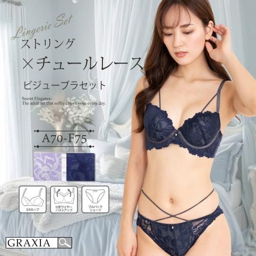 ストリング使いで素肌をセクシーに演出するブラ・ショーツセット(ブラセット)。肌に美しく映えるブラックの引き締まったカラーに蝶モチーフのチュールレースをレイヤードしたカップは落ち着いた大人の雰囲気。肩紐デザインとショーツのサイドストリングは大人の色気を演出してくれます。