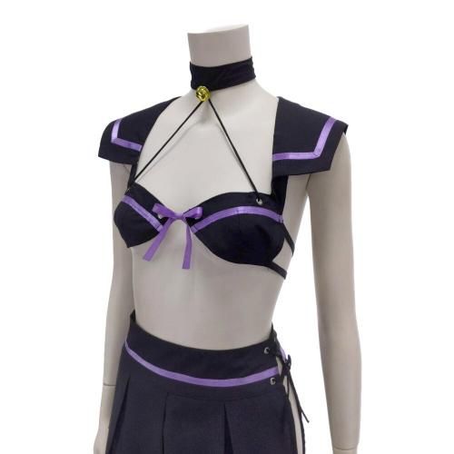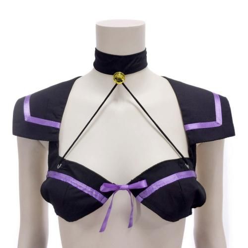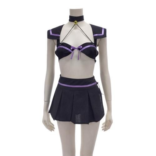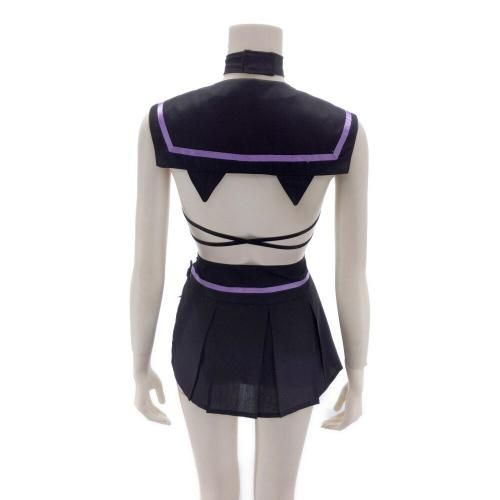 ブラタイプのトップスでセクシーに肌魅せできちゃうセーラー服風コスプレ(COSPLAY)。定番セーラー服を大胆カットでセクシーにアレンジ♪ブラックとパープルでちょっと小悪魔的なテイストに仕上げたコスチュームです。サイドスリットのプリーツスカートは超ミニ丈で、動くとヒップラインが曝け出されるというドキドキ感も♪猫耳カチューシャや網タイツ風ソックスもセットなのでいろいろなアレンジで楽しんでみて。