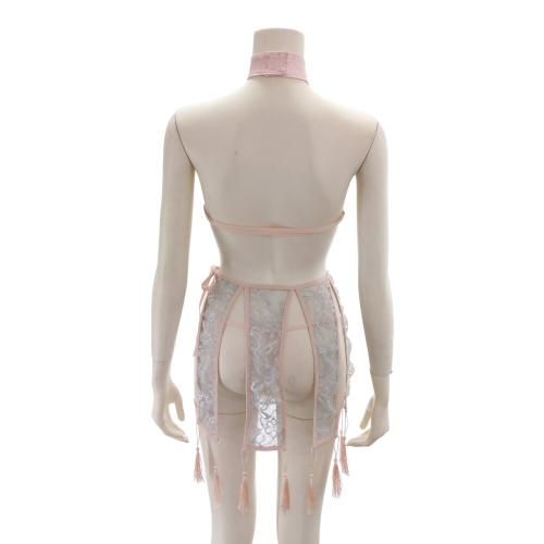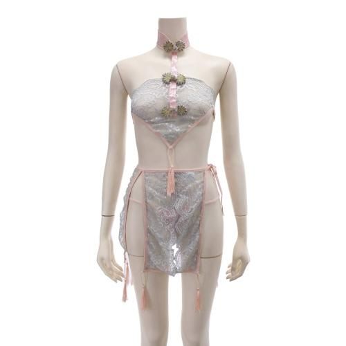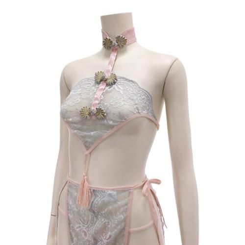 チャイナ服デザインの透け感たっぷり踊り子風コスプレ(COSPLAY)。ペールカラーのレースがふんわりと表情豊かに素肌に寄り添うコスチューム。チャイナボタンをあしらったホルターネックから透け感のあるレーストップスがボディを美しく妖艶に彩ります。ボトムはフリンジとともにひらひらと揺れて、脚やヒップラインも露わになるセクシーデザインです。