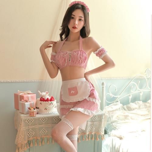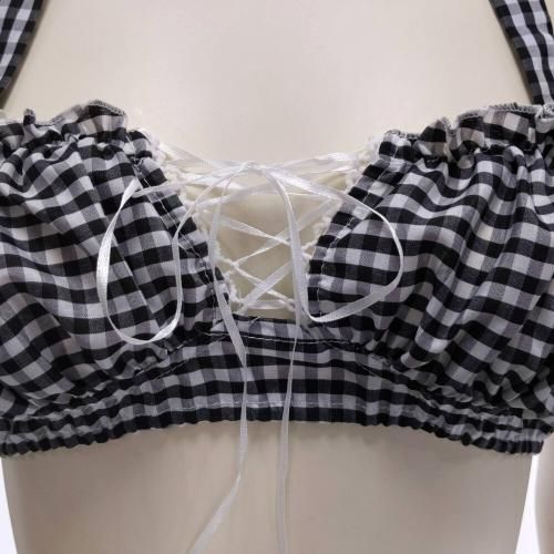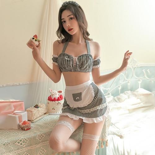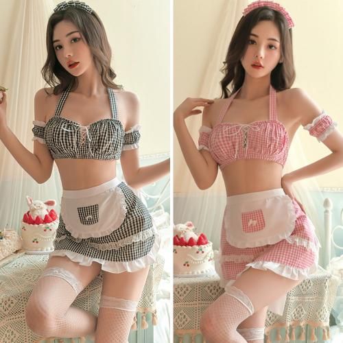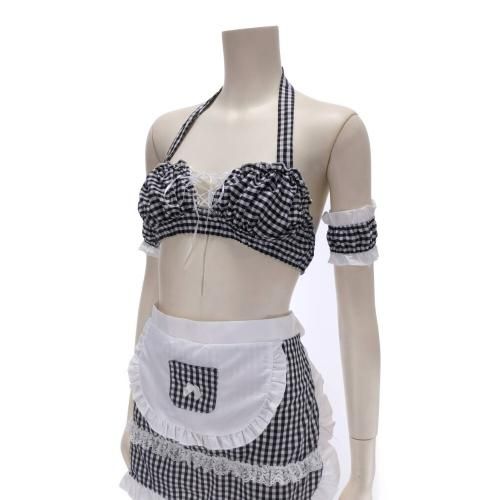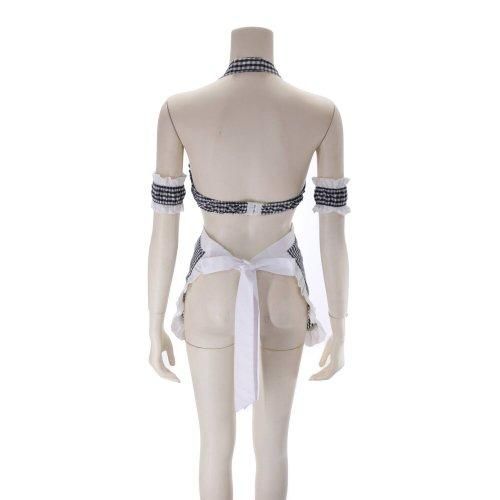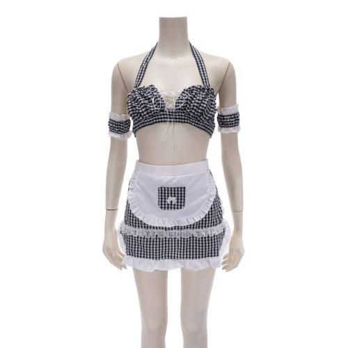 チェック柄がガーリーで可愛いウエイトレス風コスプレ(COSPLAY)。女の子っぽい雰囲気満点なウエイトレス風のアイテム。トップスはブラタイプで2列3段階ホック付き。フロント部分はレースアップになっていて胸元の開きをお好みで調整できます。エプロン付きラップスカートの下は同生地のTバックショーツ。ちらっと見える瞬間のパートナーを想像してみて♪