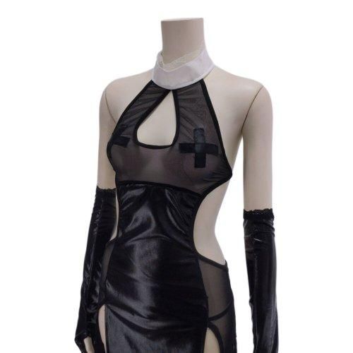 清廉さを打ち破る大胆カットのシスター風コスプレ(COSPLAY)。清らかなシスターのイメージを覆すきわどいデザインのコスチューム。胸元の透け感とカットをはじめスカート部分はスリットでレッグラインを艶めかしくさらけ出すなどセクシーが満載。スリーブはあえてエナメル素材でハードにすることでより女性らしさを印象付けます。