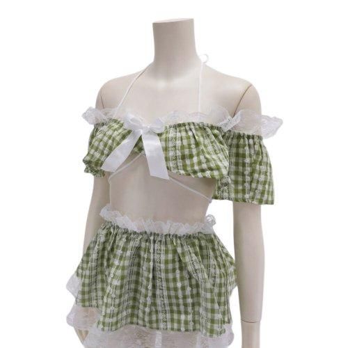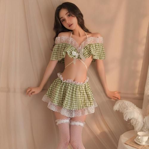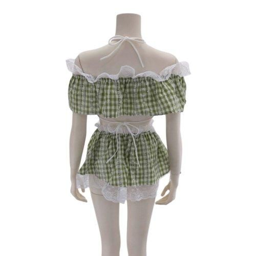マイクロミニで可愛くセクシーに肌魅せできちゃうウエイトレス風コスプレ(COSPLAY)。ギンガムチェックに小花刺繍が入ったかわいらしい生地にレースやリボンをあしらったキュートなコスチューム。淡いカラーが素肌をきれいに優しい印象に映し出してくれます。網タイツ風のニーハイストッキングでちょっとオトナな雰囲気も添えてみて♪