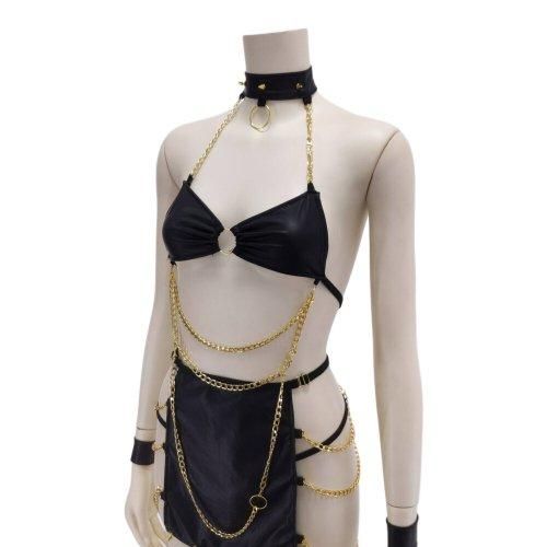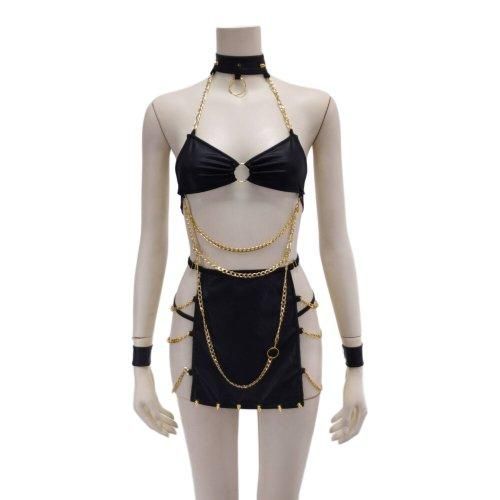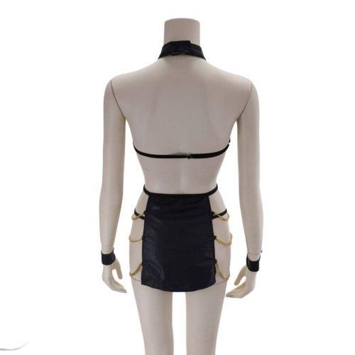 アイテム満載がうれしいセットアップタイプのボンデージ(ボンテージ)風コスプレ(COSPLAY)。スタッズを打ちこんだフェイクレザーをボンデージデザインに仕立てたブラとスカートのセットアップ。フィット感は少な目でハードなボンデージを少しソフトにアレンジしています。チョーカーのメタルリングにつなげる手錠も付属。