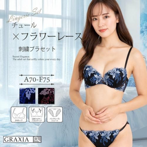 チュールとフラワーレースの繊細な魅力引き立つブラ・ショーツセット(ブラセット)。シックなベースにセンシュアルな刺繍が施されたチュールをのせ、透け感のあるレースで大人っぽく仕立てました。ソフトなカップがバストを優しく包み込み快適な着け心地。セットショーツは透け感が素肌をセクシーに演出してくれるバックレースタイプです。