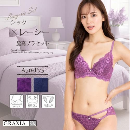 シックな色合いで落ち着きのあるブラ・ショーツセット(ブラセット)。ワントーンのシックな大人カラーですっきりとまとめたブラ・ショーツ。レーシーでエレガントなデザインでショーツのアシンメトリーでセクシーなテイストに。ブラは脇高構造で気になる脇肉をカップインし、ボディラインをゴージャスにスタイルアップしてくれます。