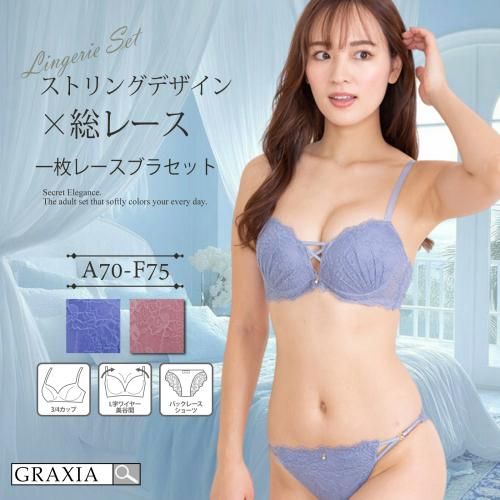 ワントーンで落ち着いた雰囲気のブラ・ショーツセット(ブラセット)。フロントのストリングデザインで谷間をおしゃれに。総レースデザインのショーツは普段から使いやすいスタンダードタイプでアウターにも響きにくいのがうれしいポイント。