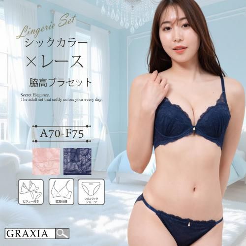 シックカラーフラワーレースブラ・ショーツセット(ブラセット)。高めのサイドボーンが脇肉をしっかりキャッチし、谷間に変えてくれます。また、L字ワイヤーのため、中央部に当たりにくくストレスなく着用いただけます。