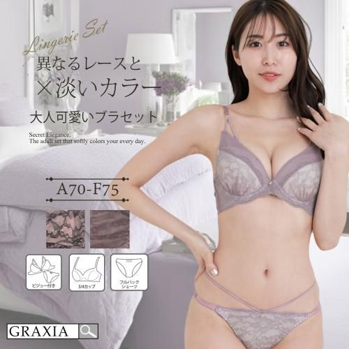 幾つもの異なるレースと淡いカラーが大人可愛いブラ・ショーツセット(ブラセット)。柔らかな色合いがエレガント。異なるレースが素肌美を引き出しストリングがアクセントになったスタイルアップな大人可愛いブラセット。