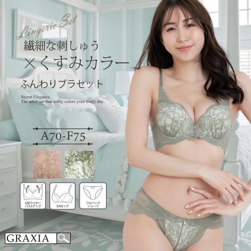 くすみカラーが柔らかな印象のブラ・ショーツセット(ブラセット)。くすみカラーが美しく肌になじみ、中心部が高いワイヤーでバストをしっかりホールドし、丸みのある美しいバストラインに仕上がります。ショーツはヒップを包み込む総レース素材で、鼠径部への締め付けもないので着心地抜群。