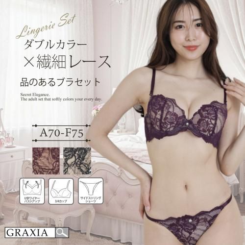 ツートンカラーが落ち着きある柔らかな印象のブラ・ショーツセット(ブラセット)。ベージュの下地がレースのカラーを柔らかく魅せ、落ち着きあるデザインに。前中心が高いワイヤーがバスト支えて上方向に持ち上げるので、丸みのある自然なバストができます。ショーツは総レースヘルシーな印象で、脇高で脇に流れるお肉をバストに入れ込みやすい人気デザインです。