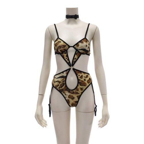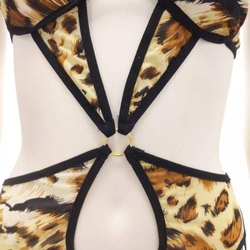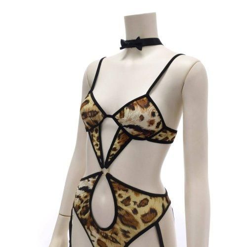 ストリングデザインの肌魅せがセクシーな女豹風ガーターランジェリー(GARTER LINGERIE)。ヒョウ柄のちょっと透け感のあるソフトメッシュ生地で仕立てたセクシーランジェリー。テディデザインで絶妙なカッティングがパートナーの気分を高揚させます。猫耳カチューシャを着けていつもと雰囲気を変えてちょっと小悪魔的に迫ってみて♪背中のホックは2列3段でサイズ調節が可能。Oバックのヒップはバックスタイルからでも興奮を誘います。