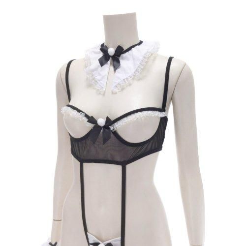 これ以上ないほどの大胆デザインがまぶしいメイド服風コスプレ(COSPLAY)。常識をおおいに覆す、これはもう反則レベルのコスチューム♪間違いなくパートナーの興味を誘うアイテムです。メイドさんと察するのは襟元と帽子のみ。あとはバスト、クロッチを含め、ほぼオープンスタイルで構成。付属。アイテムも充実でとことん楽しめちゃいそう。