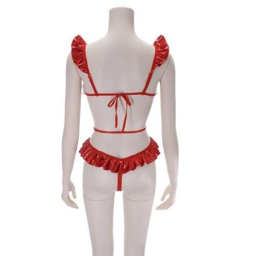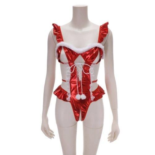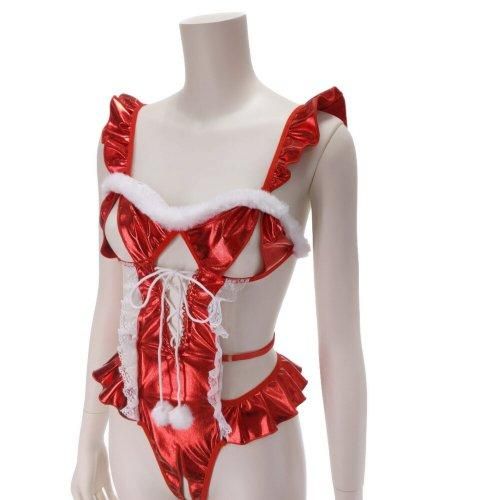 メタリックが個性的なサンタガール風コスプレ(COSPLAY)。フリルとレースの可愛さにクールなメタリックカラーが個性的なサンタガール♪オープンのバストトップとクロッチで大胆な時間を過ごせそう。