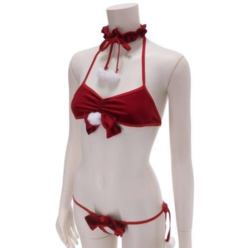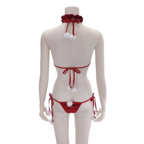 極小面積のブラショーツセットサンタガール風コスプレ(COSPLAY)。必要なところだけを隠した面積の小さなブラとオープンクロッチのセクシー全開のショーツ&着脱もストリングのみの大胆デザインで熱い夜を過ごして♪