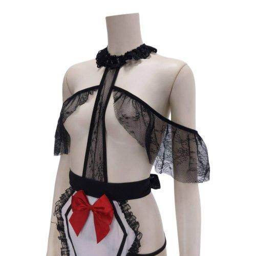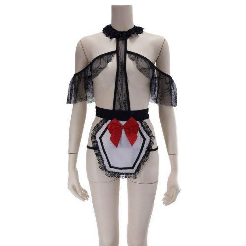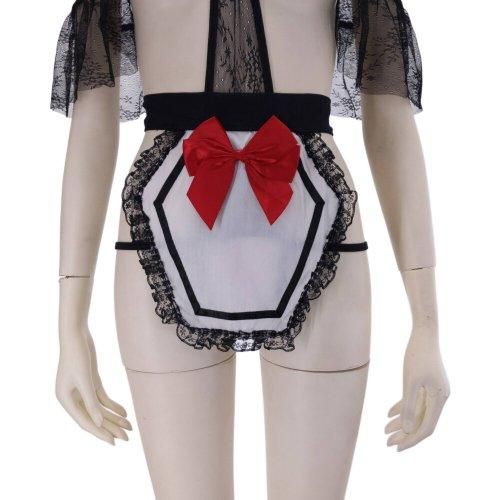 面積狭めでバックスタイルもインパクト大のウエイトレス風コスプレ(COSPLAY)。ストレッチレースのテディをベースに可愛いエプロンを添えて、かなり露出多めのコスチュームに仕上げました。さらにバックはストリングのみで仕立て、パートナーに強烈インパクトをあたえるのに充分なセクシーデザインです。