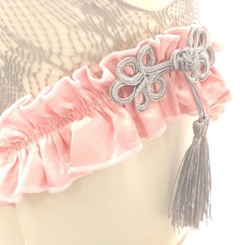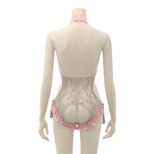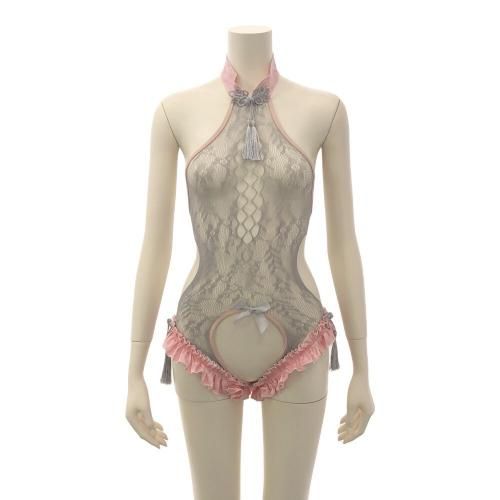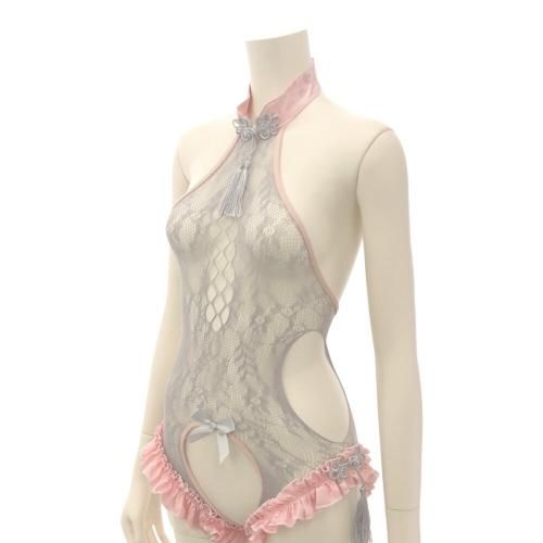 網タイツにキュートなフリルが堪らないチャイナ服風テディ(TEDDY)。落ち着いたグレーの網タイテディとキュートなピンクフリルが男心をくすぐる。ウエストはカットアウトで細見えし、フロントからヒップまで大きく開いたオープンクロッチでバックスタイルからもパートナーをドキッとさせる。セットのニーハイ網タイツが絶対領域を生み出し、「可愛い」と「セクシー」がバランスよく融合。フェチには堪らない1着。