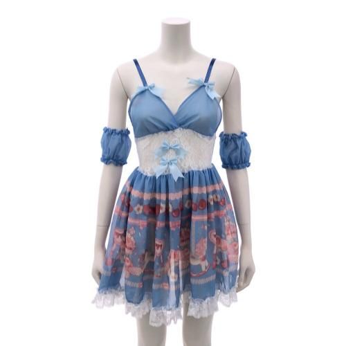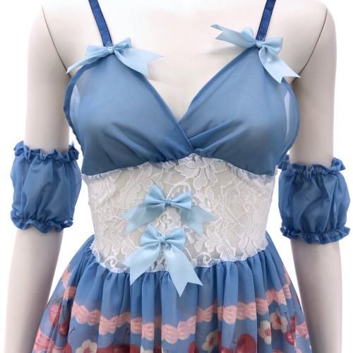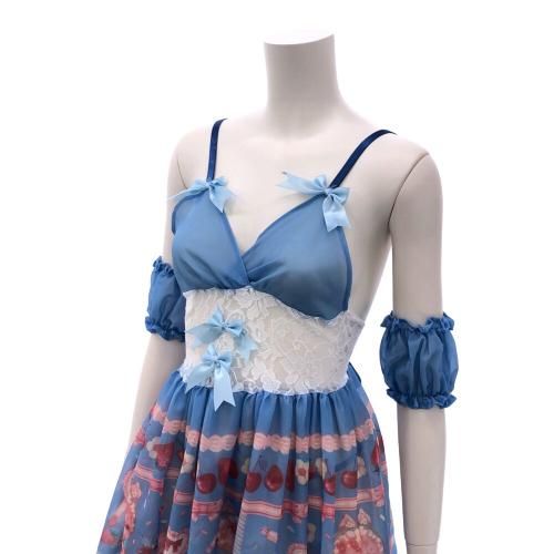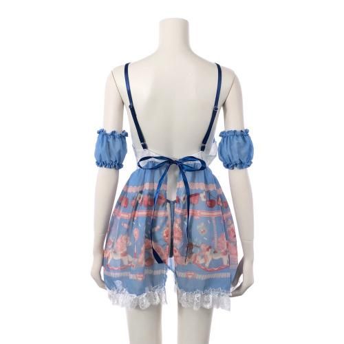 甘ーい誘惑についつい指先が伸びそうなウェイトレス風コスプレ(COSPLAY)。ライトブルーの淡いカラーにレースを施し、イチゴや生クリームなどたくさんのスウィーツプリントがガーリーでメルヘンな世界観溢れるコスプレ。エプロンのように簡単着脱で、ふんわりスカートが揺れる裾からヒップがチラ見え。ショルダーストラップはアジャストで調整可能。