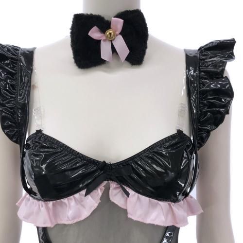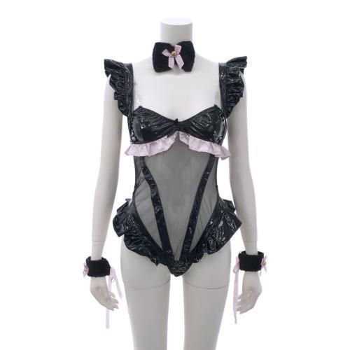 スケスケメッシュが大胆可愛い子猫風コスプレ(COSPLAY)。キュートなもふもふお耳に、チュールとフェイクレザーの悩殺デザインが大胆。Vラインギリギリを攻めるチュールに、超ハイレグフリルのフェイクレザーがフロントもバックスタイルも発情を迎えた猫のようにセクシー♪ブラホックで着脱可能。いつもと違う彼女の一面を楽しめるかも。